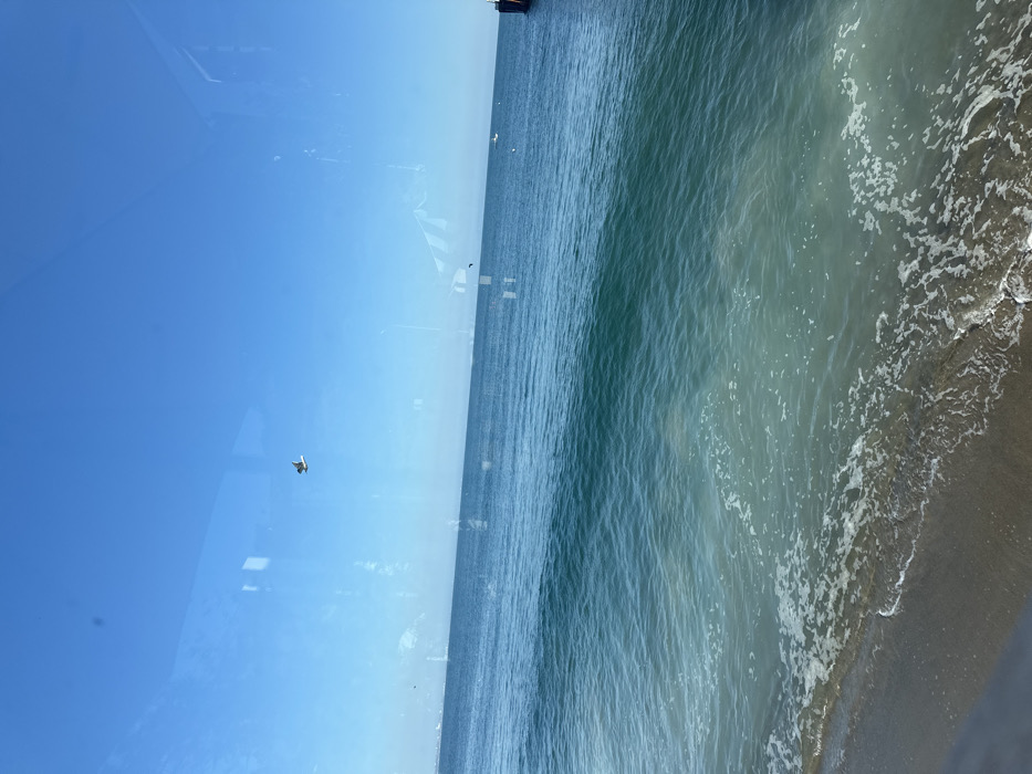 The image captures a coastal scene along the Pacific Ocean in Malibu, California, United States, viewed through a reflective glass surface. The upper portion displays a clear, vibrant blue sky with visible reflections of interior structures. A single white and gray seagull is depicted in flight in the upper-left quadrant. The central and mid-ground consist of the ocean, exhibiting a gradient from turquoise near the shore to deeper blue further out, with a visible wave cresting and breaking into white foam towards the bottom-left. A narrow strip of wet, light brown sand is present in the lower-left foreground where the waves meet the land. On the far right, a dark, vertical structure, possibly a pier support or coastal marker, is partially visible. Several small, dark, indistinct objects are discernible on the distant ocean surface. No human subjects or distinct human-made objects, aside from the potential pier structure and distant maritime elements, are identifiable.