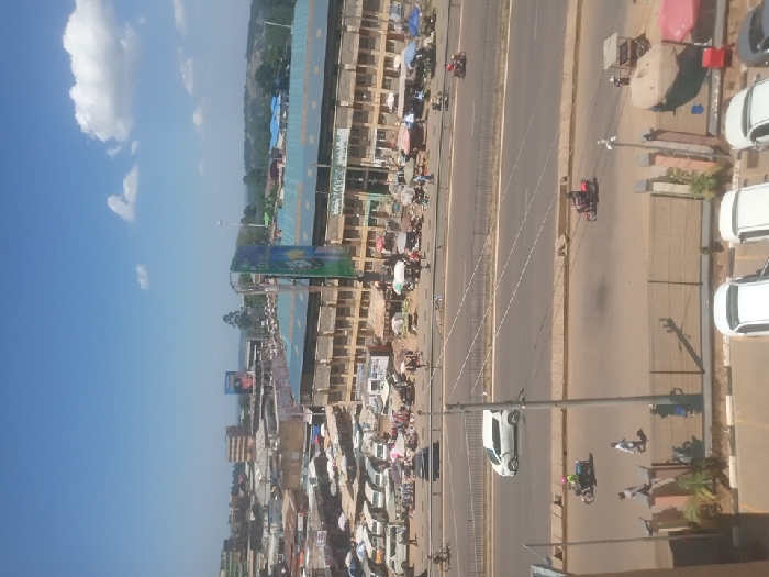 A daytime, aerial view captures a bustling urban scene. Buildings line one side of a wide road, with numerous market stalls clustered in front. Cars are parked adjacent to the fence. Traffic flows along the road with motorbikes and pedestrians, and the road is partially divided by barriers. A blue sky with puffy clouds is visible overhead.