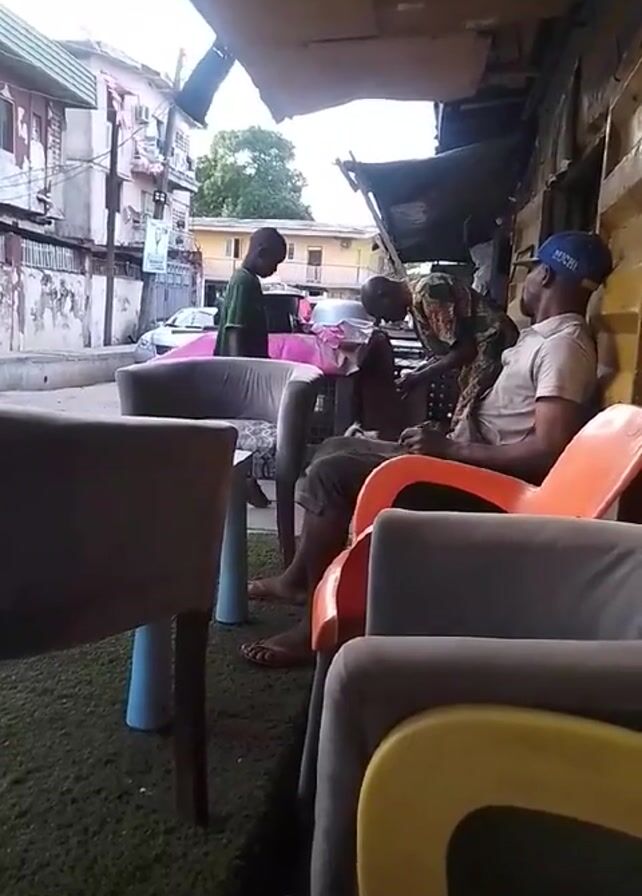 n outdoor scene in what appears to be a public space or informal outdoor cafe. Several people are seated in chairs under a covered area, which looks like an extension of a building or shop. A young boy in a green shirt stands near the seated individuals, appearing to be interacting with them or perhaps offering something. The seated individuals include at least one man in a blue baseball cap and another person wearing a patterned headscarf. One of the men is leaning back in his chair, seemingly relaxed. There are other people visible in the background on the street, and some buildings are visible across the street. The space in front of the seating area has what looks like artificial turf or green matting. The shot is taken from inside the covered area, focusing on the interaction between the boy and the seated individuals. The lighting suggests it is daytime, but the scene is somewhat shaded due to the overhead cover.