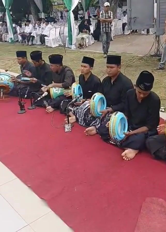 group of six young men sitting cross-legged on a red carpet outdoors. They are all wearing black shirts and pants with traditional black caps. Each of them is holding and playing a small, colorful drum called a tambourine. A man in a black shirt and cap sits to the left of the group, singing into a microphone. Two larger drums are positioned in front of him. Behind the group, people are seated in rows of white chairs under a green and white draped canopy. Other people are standing and walking around, and a small trailer is parked nearby. The ground is paved, and green trees and grass surround the area.