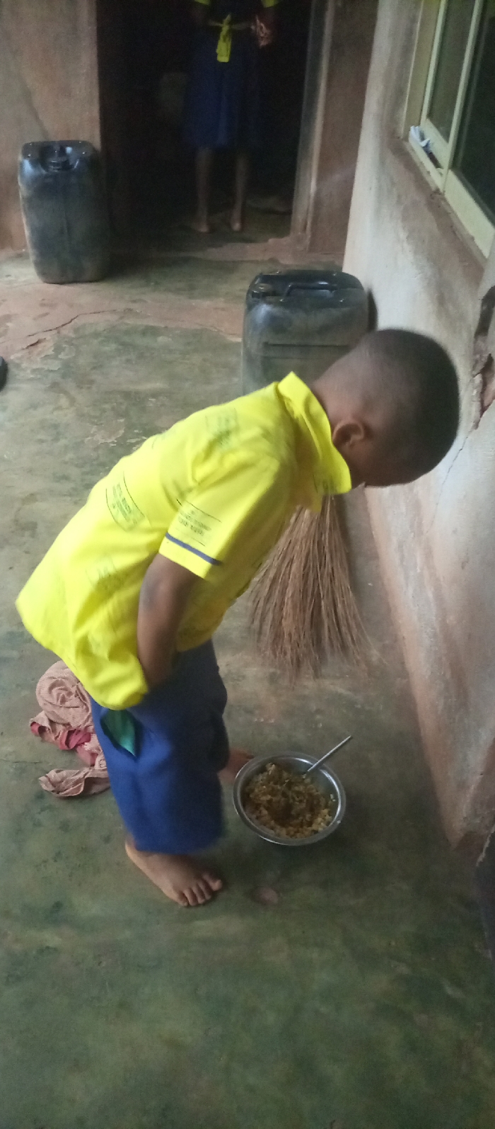 A young boy in a yellow shirt and blue shorts stands barefoot near a wall. He appears to be looking down at a metal bowl filled with food and a spoon. His left hand is in his pocket. A broom leans against the wall behind him. Two large black jerrycans are visible in the background near a doorway where another person's legs are visible. The floor is concrete. A piece of patterned cloth rests to the left of the boy. A window is seen on the right.