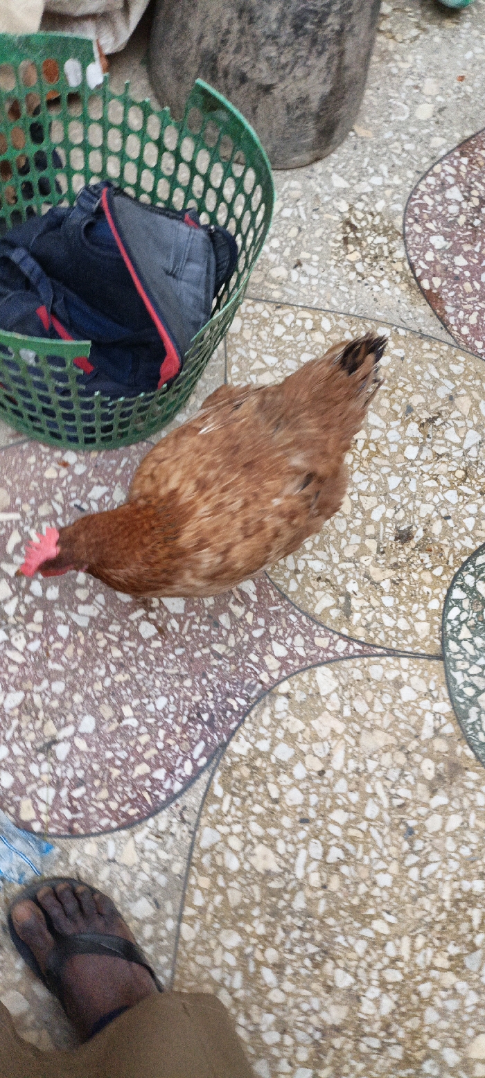 A brown chicken pecks at a tiled floor with circular patterns. A green plastic basket with blue and red fabric inside sits nearby. A large gray pot is in the background. A foot wearing a black flip-flop is visible in the lower left corner of the frame. The floor tiles feature a mix of beige and speckled brown, creating a mosaic-like effect.