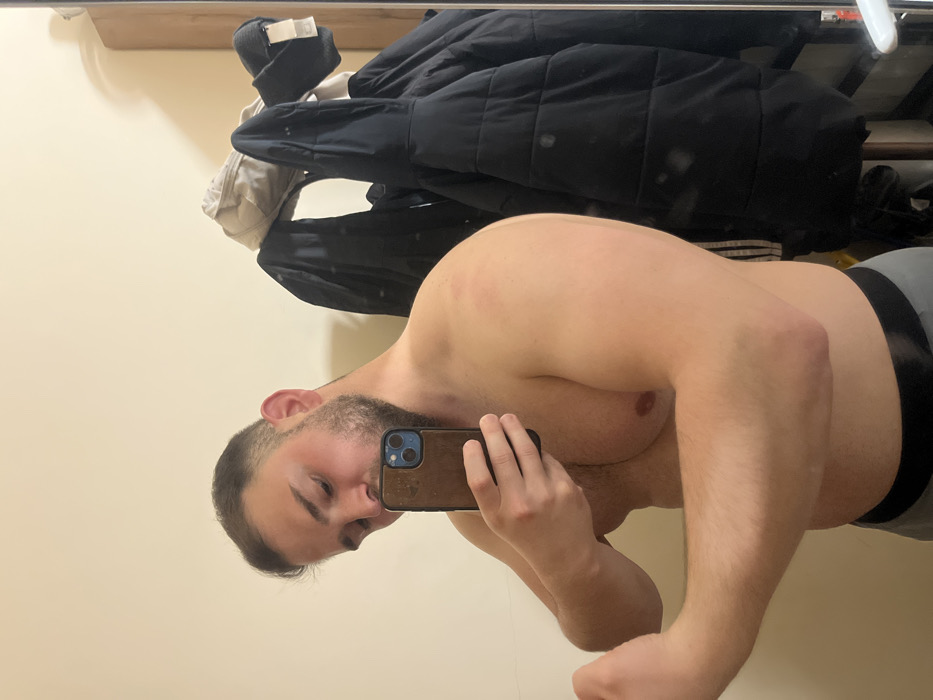 An adult male is depicted taking a mirror selfie indoors. The subject, shirtless and wearing dark underwear with a grey waistband, has a light skin tone, short brown hair, and a full, short beard. He exhibits a muscular build, particularly in his chest and flexed right bicep. His left hand holds a smartphone, identifiable by its brown case with blue camera accents, directed towards the mirror. His attention is focused on the phone screen or his reflection. Minor reddish marks are visible on his right shoulder. The background features a plain, light-colored wall. To the subject's right, the mirror reflects a clothes rack holding several dark puffer jackets, a light-colored cap, and a dark beanie with a white tag. A wooden door frame or edge is visible at the far right. The specific location within Sofia, Bulgaria, cannot be determined from the visual evidence presented in the image.