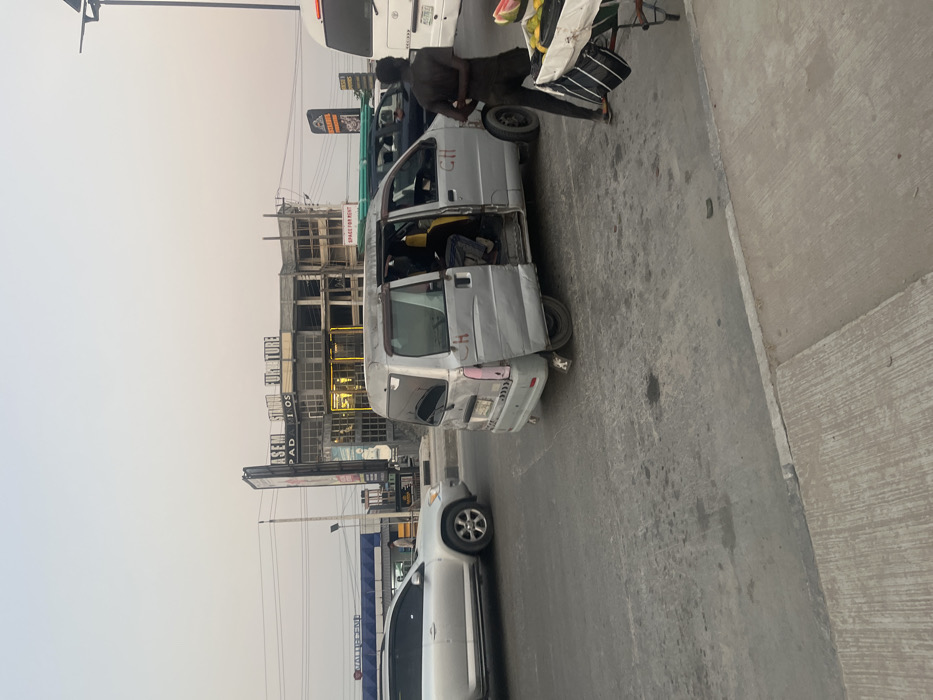 A three-wheeled vehicle with damaged panels is parked on the side of a road. A man is next to the vehicle. In the background, there's a white vehicle and buildings with signs, including "ASEM STUDIO FURNITURE" visible. A billboard and power lines are also present. The lighting suggests it's daytime with a slightly overcast sky. The road surface appears to be concrete or asphalt.