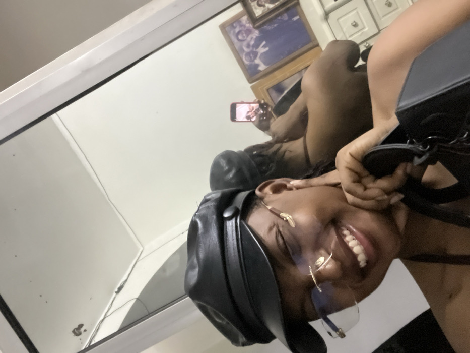 A person wearing glasses and a black hat smiles broadly, holding a black purse strap. The image is a mirror selfie with the reflection showing the person taking the photo with a phone. In the background, framed pictures hang on the wall above a white cabinet. The lighting is bright and the angle is slightly tilted.