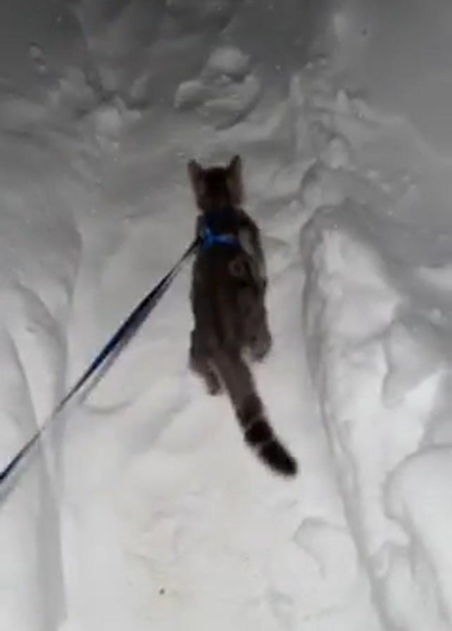 cat with a gray coat and black stripes walking through deep snow on a narrow path. The cat is wearing a blue harness and leash. The camera follows from behind as the cat moves forward. The snowbanks on either side of the path are tall. The sky is dark, suggesting it's night or a dimly lit area.