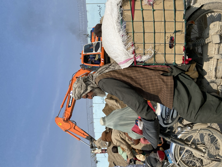 In a sunlit scene, an excavator, labeled "DOOSAN," reaches towards a wired fence with writing. A man in a headscarf and waistcoat stands beside a loaded motorbike. The motorbike is laden with a grid-secured cardboard box and a white bag, while additional clothing covers it. Other people are situated nearby with one woman in a burka.