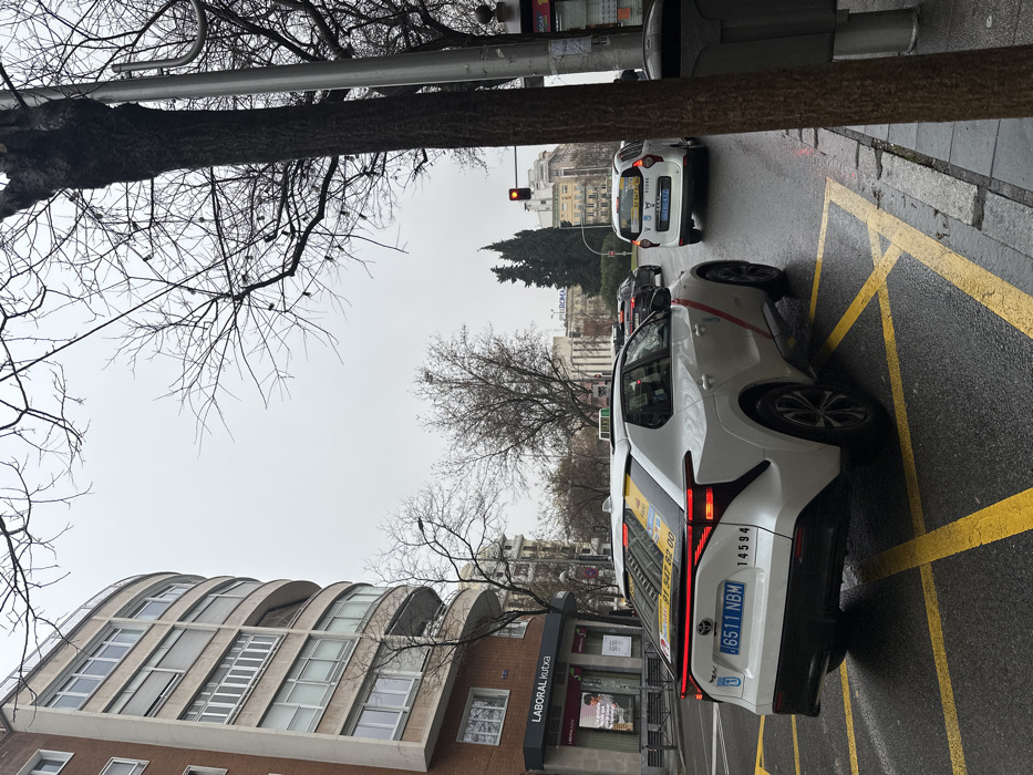 The image depicts an urban street scene in Madrid, Spain, specifically on Calle de Princesa, with the "LABORAL kutxa" bank at number 48 visible on the left. The scene is illuminated under an overcast sky, with visible moisture on the asphalt, indicative of damp conditions. In the foreground, a white Toyota bZ4X electric SUV taxi, bearing Spanish license plate 6511 NBM and taxi identification number 14594, is stationary on the wet asphalt. The vehicle is positioned over prominent yellow crosshatch road markings. It features yellow taxi signage on its roof and rear window, and red and white diagonal stripes on its side. Ahead of this vehicle, further down the street, a second white minivan taxi and several other dark-colored cars are also stationary in a traffic lane. A red traffic light is visible in the distance, controlling traffic flow. To the left of the road, a multi-story building with a curved facade composed of brick and lighter-toned panels is prominent. The ground floor of this building houses a "LABORAL kutxa" bank branch. On the right side of the image, the dark, bare trunk and skeletal branches of a large deciduous tree frame the scene. Adjacent to the tree, a metal pole and the upper portion of a black public waste bin are visible on the sidewalk. No individuals are clearly identifiable within the frame.