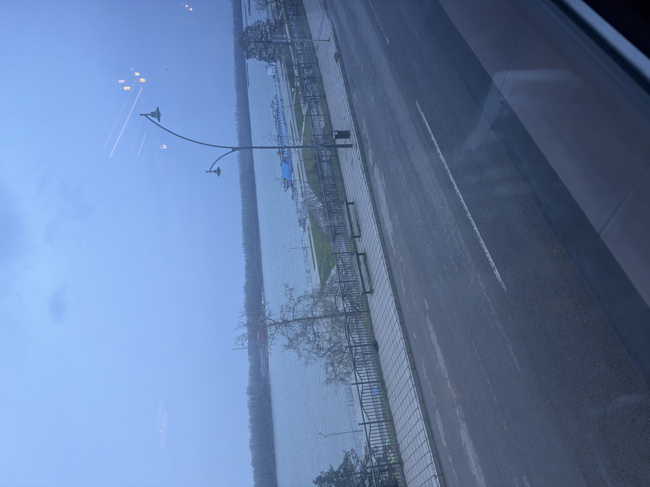 The image displays an exterior view of the Danube River waterfront in Ruse, Bulgaria, under an overcast sky, observed from an elevated position, likely through a window as indicated by reflections in the upper right quadrant. In the immediate foreground, a dark, wet asphalt road with a single solid white line extends diagonally. Adjacent to the road is a paved promenade constructed of light-grey square tiles. On this promenade, two empty dark-colored park benches and a black cylindrical trash receptacle are present. A black metal fence with decorative scrolled railings separates the promenade from a lower embankment. An arched black lamppost with two luminaires extends over the promenade and road. The midground is dominated by the wide, grey-blue expanse of the Danube River. Along the near bank, a concrete path runs parallel to the river, bordered by sparsely vegetated ground containing bare trees and shrubs. A large blue and white barge or vessel is visible on the river near the bank. The background shows the opposite bank of the Danube, densely covered with bare trees. Beyond these trees, an industrial facility with a prominent tall, slender smokestack and other structures is discernible. The sky is entirely overcast, presenting a uniform dull blue-grey. No individuals or active vehicles are observed within the scene.