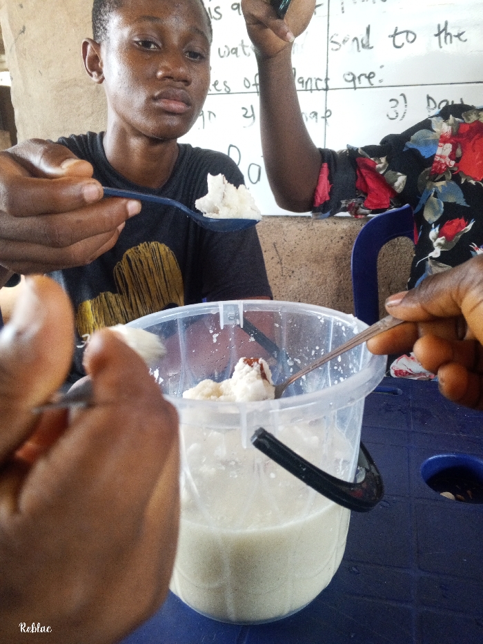 The image captures three individuals sharing food from a transparent plastic bucket in Ukwu-Abwa, Nigeria