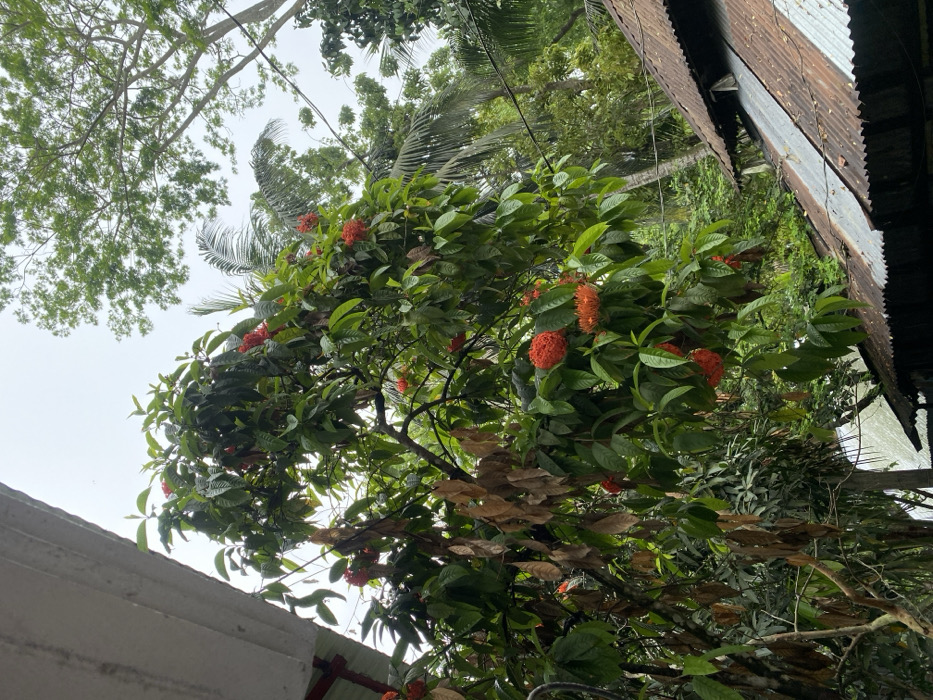 This image depicts an outdoor scene in Hizla, Bangladesh, under an overcast sky. The central subject is a large tree with dense green foliage and numerous spherical clusters of bright orange-red flowers, identified as Ixora. Several brown, dried leaves are interspersed among the green leaves on the tree's branches. In the upper left quadrant, a segment of a light-colored, possibly concrete or stucco, building overhang and wall is visible. The background features additional lush green trees, including the distinctive fronds of a palm tree. In the lower right corner, a section of a weathered and rusted corrugated metal roof is present, indicating another structure below the primary line of sight. No individuals are present in the frame, and no specific actions or interactions are depicted.