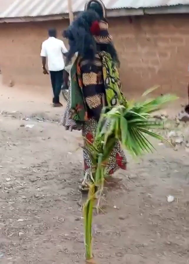 person in a colorful costume and black mask walking in an outdoor area. The person carries some greenery in their hands. A man in a white shirt and black pants walks in the background. The person in the costume walks closer to the camera, past a small tree trunk. The ground is a mix of dirt and small stones. A building with mud-colored walls and a corrugated metal roof is visible in the background. Another person in shorts and a green shirt stands to the right. There are cheering sounds audible.