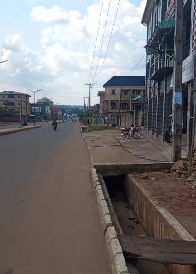 n empty asphalt road in a developing urban area. Buildings line either side of the street, most appearing to be two-story residential structures. Power lines and streetlights are present. A few motorcycles are seen travelling on the road, with little other visible activity. There is a drainage ditch on the right. The sky is partly cloudy.