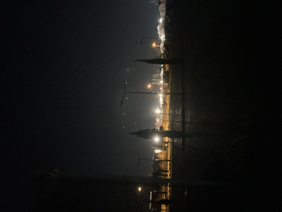 A dark, blurry landscape at night features a row of streetlights illuminating a wet surface, likely a road, that reflects the light. There are some buildings in the background. A couple of tall, slender trees can be seen amidst the lights. The overall atmosphere is muted and indistinct due to low lighting and possible rain or fog.