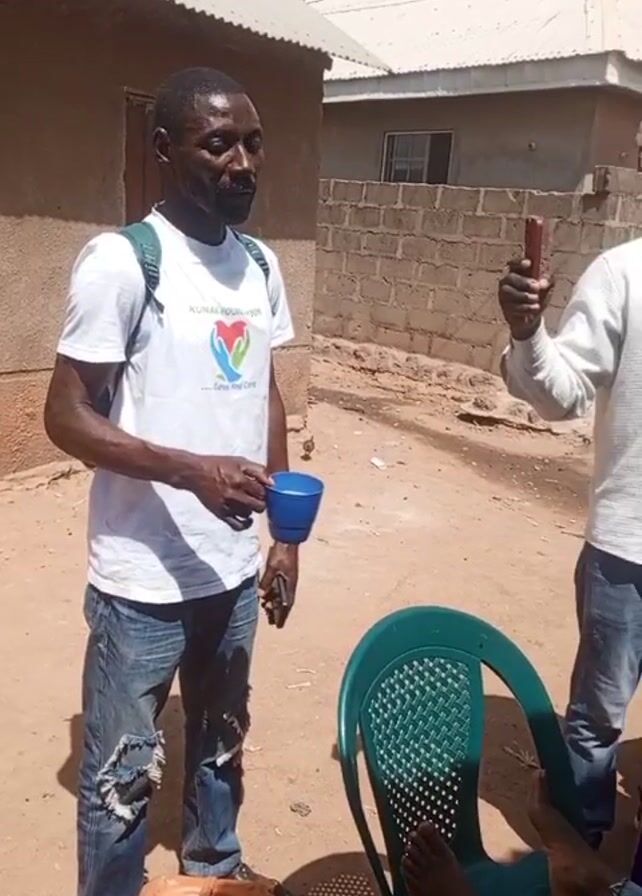 A man stands in front of a gathering of people outdoors. He wears a white t-shirt with a logo on it, blue jeans, and brown sandals. He holds a blue cup in his left hand. Another man, wearing a white button-down shirt and blue jeans, is using his phone to record. A group of people are seated around a makeshift table with food and supplies. The people are dressed in casual clothes, and some wear t-shirts with the name "Keturah" on the back. The environment looks like a residential area with houses and a dirt yard. Some are eating and others are looking at their phones.
