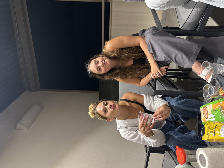The image depicts two young adult females seated on an outdoor balcony or terrace at night, likely in Givat Shmuel, Israel