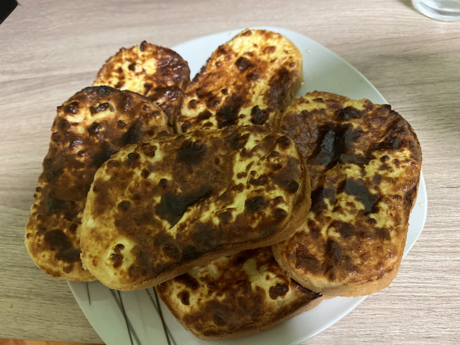 The scene is located in Vratsa, Bulgaria. Six oblong, baked food items are presented on a white plate with a subtle grey linear design on its rim. The food items exhibit a golden-brown crust with irregular, darker, and more intensely browned areas. Lighter, creamy yellow patches are visible beneath the darker crust, suggesting a filling or topping. The items are stacked, partially overlapping. The plate rests on a light-colored wooden surface, likely a table or countertop, displaying a visible grain pattern. No individuals or active interactions are depicted. The environment appears to be an indoor setting.