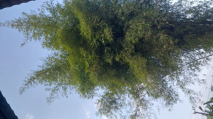 The scene, located in Lhokseumawe, Indonesia, features a dense clump of green bamboo trees occupying the majority of the vertical frame. The bamboo exhibits abundant small green leaves and visible culms. Above the bamboo, a clear, light blue sky with sparse white cloud formations is visible. Dark, reddish-brown architectural elements, consistent with a roof overhang, are present in the extreme top-left and top-right corners of the image. In the lower-left quadrant, a concrete utility pole with multiple dark power lines strung horizontally is partially visible, situated amidst additional green foliage. No human figures or specific actions are observed within the frame. The environment is outdoors, under natural daylight.