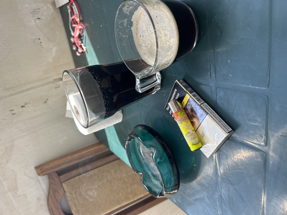 The image captures a detailed close-up of a tabletop scene in Varna, Bulgaria, under natural light, likely outdoors or on a balcony. A green, textured plastic table serves as the surface. In the left foreground, a dark teal-colored glass ashtray contains remnants of ash, from which a thin plume of smoke visibly rises, indicating a recently extinguished or burning cigarette. Adjacent to the ashtray, a sealed pack of "Davidoff" brand cigarettes, labeled "Класически" (Classic) in Bulgarian, lies flat. A yellow "Clipper" lighter adorned with a cartoon graphic rests on top of the cigarette pack. To the right, two clear glasses containing dark beverages are present. The taller glass, with a subtly fluted design, holds a dark, bubbly liquid. The shorter, wider glass contains a dark liquid topped with a substantial layer of light brown foam, consistent with coffee. In the background, a light-colored, unpainted wall with a rough texture is visible. The top section of a wooden chair back, featuring a light brown cushion, is positioned to the left background. Further to the right in the background, a white roll of paper (possibly toilet paper or paper towels) and a small cluster of red beaded items, resembling bracelets or traditional martenitsas, are also present on the table.