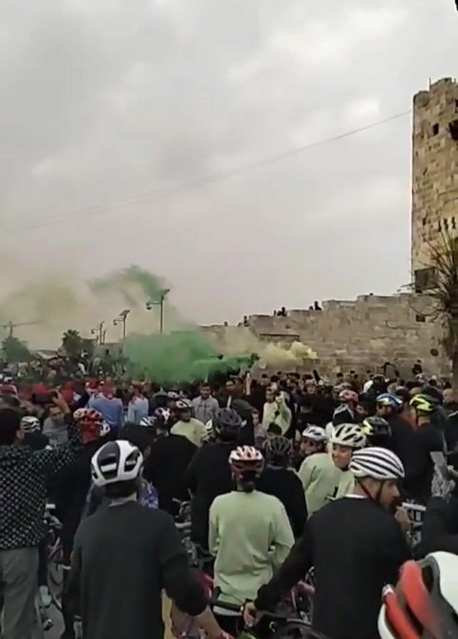 The video depicts a large crowd of people, many wearing cycling helmets, gathered in front of a stone structure that resembles a fortress or ancient wall. Green smoke fills the air, obscuring parts of the scene and adding an element of spectacle or possibly protest. The crowd appears dense, with individuals standing close together and facing in the same direction. Some people are holding bicycles, further suggesting that the event is related to cycling. The sky is overcast, contributing to a somewhat subdued or muted atmosphere. Beyond the crowd and the stone structure, buildings and street lamps can be seen, indicating an urban setting.