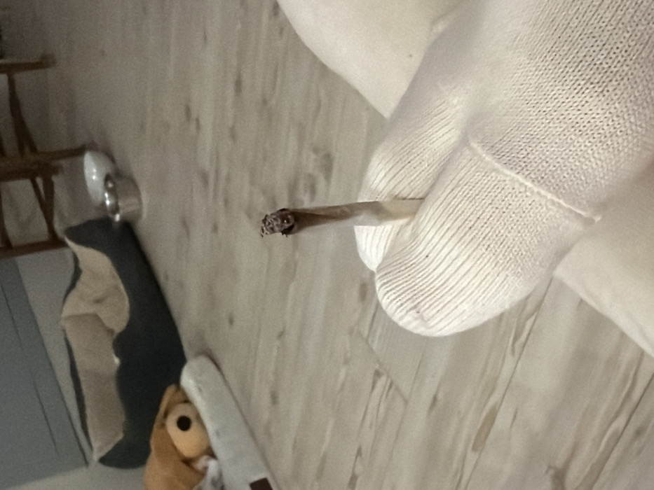 A hand in a white knitted glove holds a lit cigarette or joint