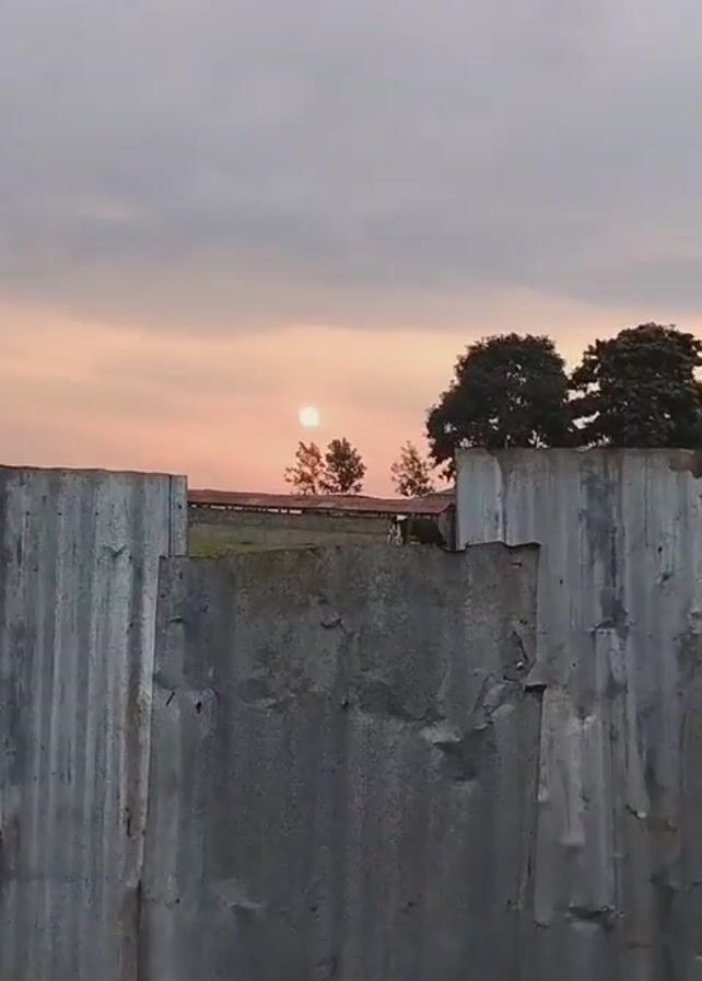 sunset viewed through a gap in a weathered corrugated metal fence. The sky is a soft pink, with the sun visible between silhouetted trees and a building with a reddish roof. The fence in the foreground appears old and worn. A cow is partially visible. The camera gradually zooms in.