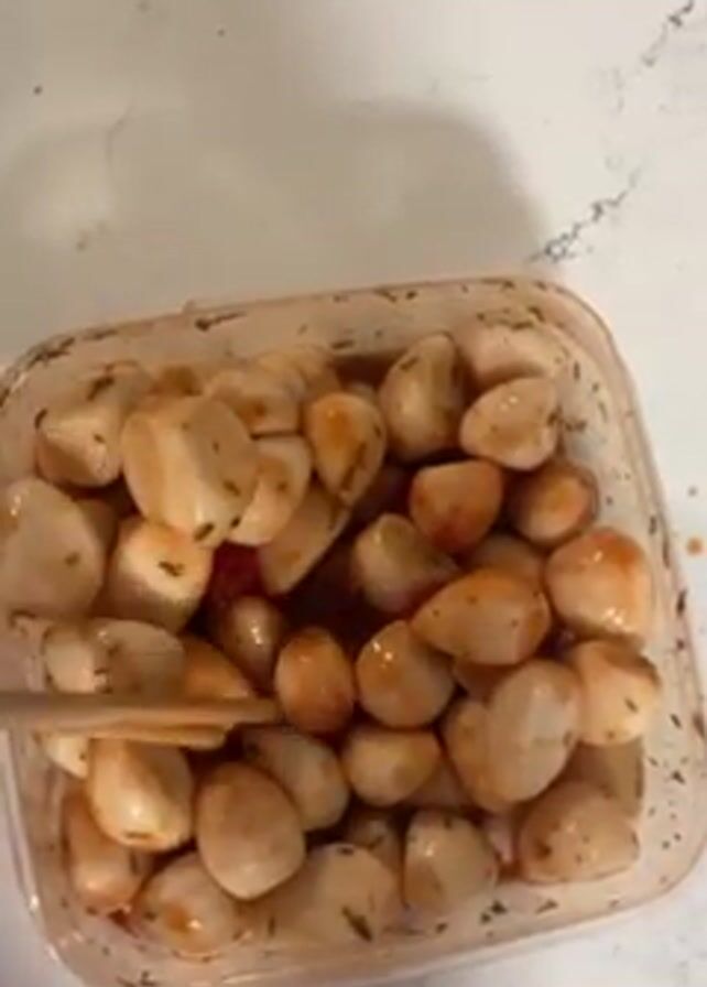 - "A close-up overhead shot displays a clear plastic container filled with numerous peeled garlic cloves, coated in a reddish-brown sauce and flecked with herbs" by FM-AyUtz1, licensed under CC BY 4.0