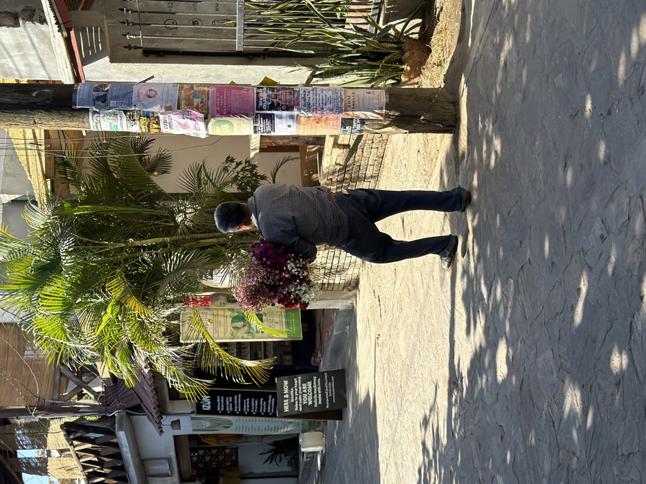 The image captures a sunny pedestrian street in Mazunte, Mexico. A man, viewed from behind, is walking left-to-right across the frame while carrying a large, vibrant bouquet of red, magenta, and white flowers in his left arm. He wears a checkered shirt in gray and white tones, dark blue trousers, and open-toed sandals. The street is paved with light-colored, irregularly shaped flagstones, which are partially covered by dappled shadows cast by unseen foliage above. To the left, several buildings are visible; one features a dark corrugated roof, a light-colored stucco facade, and an exposed wooden balcony railing. Below, a black signboard for "IZUN" lists services such as "Temazcal," "Massage," and "Yoga." Adjacent is an A-frame sign reading "HERE & NOW" with additional text. A large, lush palm tree with bright green fronds stands between the buildings and the street. On the right side of the street, a sturdy wooden utility pole is heavily plastered with numerous layered paper posters advertising various local events and services, including "CUMPA MINGA," "RADICAL EXPRESSIONS," "NEW YEAR CELEBRATION," and "YOGA MASSAGE." Behind the pole, a building with a light-colored facade, a dark metal gate, and potted snake plants are visible. The overall scene indicates a bustling commercial or tourist area with tropical vegetation under clear skies.
