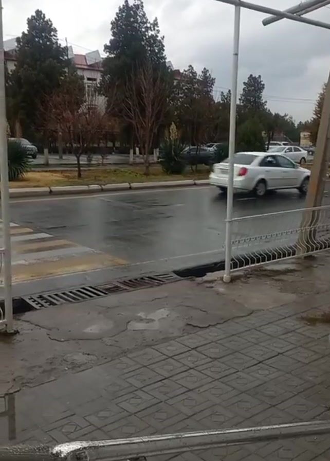 street scene on a rainy day. The camera is positioned behind a railing, possibly at a bus stop or sheltered area. Cars drive along the wet asphalt road, including white and yellow vehicles. A crosswalk is visible on the road. On the other side of the road are trees and buildings. A red cross is attached to a pole above the sidewalk. The sky is overcast.