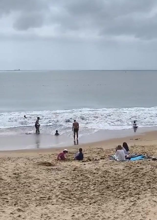 The scene is a beach on a cloudy day. The sky is overcast with grey clouds, and the water is a muted grey color. Several people are enjoying the beach. Some are in the water, with waves gently breaking on the shore. One person stands waist-deep in the water, while others are further out, either swimming or playing. Closer to the camera, a few people are sitting or lying on the sand, some on a blue blanket. A small group of children are playing in the sand, seemingly building something. The sand is a tan color, and the beach stretches out to the horizon. A ship can be seen distantly on the horizon, adding to the vastness of the ocean. The overall atmosphere is calm despite the lack of sunshine.