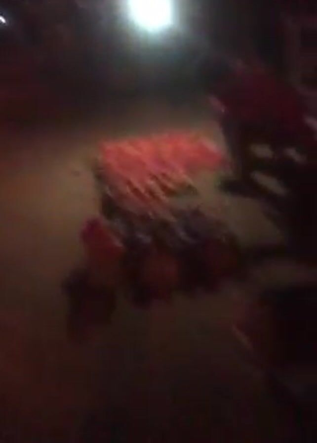 At night, a person in a red shirt is hunched over a large pile of red tomatoes, sorting them under the bright light of a vehicle