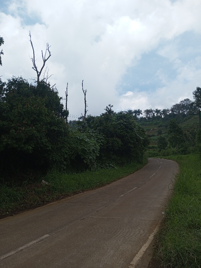 The scene in Vieng Phouka, Laos, depicts a two-lane concrete road curving gently to the right as it ascends a slope