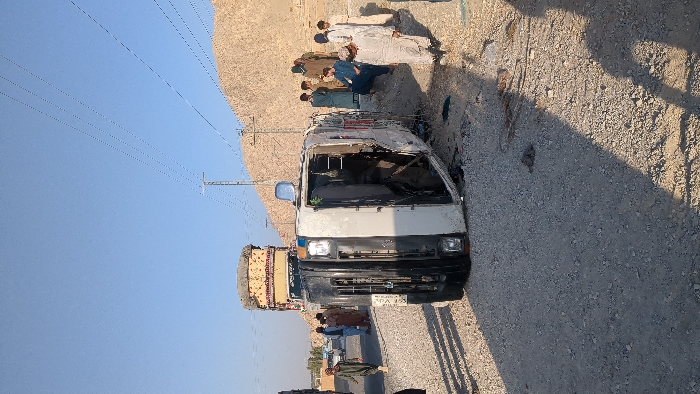 The image depicts a vehicular accident scene in Kuchlak, Pakistan, on a dirt and gravel roadside