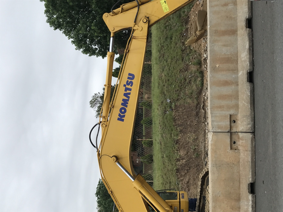 A yellow Komatsu excavator arm extends upward with blue lettering. The background includes green trees and a cloudy sky. Beside the excavator, there is a grassy area. Concrete barriers are positioned next to a paved surface, possibly a road or parking area. The excavator appears to be situated near a construction site.