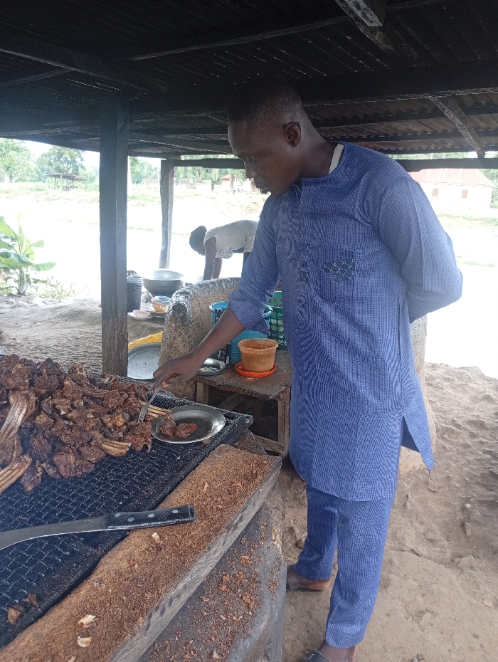 The image displays an outdoor grilling and food preparation area under a rudimentary shelter in Assai Sabongida, Nigeria
