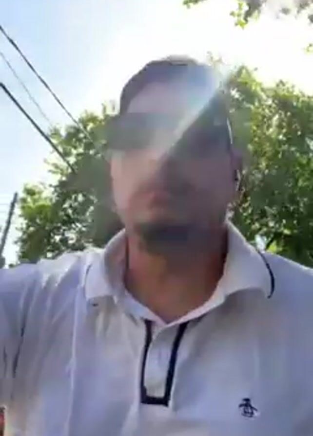 A man wearing a white polo shirt and sunglasses looks into the camera, raising a hand and then giving a thumbs-up gesture. He seems to be moving, possibly on a bicycle or scooter, with trees and the sky visible in the background, along with power lines. The sun is bright, creating a glare. The video appears to be shot in a residential or suburban area.