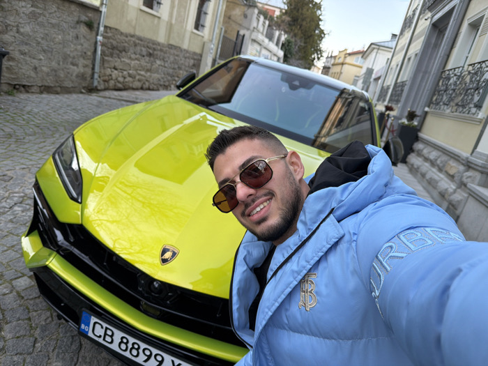 A male individual with short dark hair, a beard, and sunglasses is depicted in a selfie, smiling directly at the camera. He wears a light blue puffer jacket featuring a "TB" monogram on the left chest and "BURBERRY" embroidered on the left sleeve, with a black hood visible beneath. He is positioned in front of a bright lime green Lamborghini Urus SUV, which occupies a significant portion of the left side and center of the frame. The vehicle's front bumper, hood, and windshield are clearly visible, displaying a Bulgarian license plate "BG CB 8899 YX" on its lower front grille. The scene is an outdoor urban environment, with the ground paved entirely with cobblestones. To the left of the vehicle, a stone wall rises alongside the street. To the right, a multi-story building with a light-colored, detailed facade and balconies with decorative wrought iron railings is present. The architectural style, including the cobblestone street and traditional buildings, is consistent with the Old Town area of Plovdiv, Bulgaria.