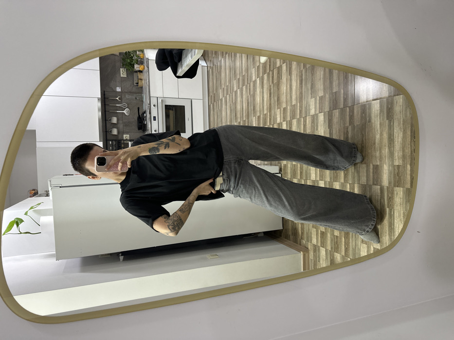 This image depicts a full-body mirror selfie taken by an individual in an apartment located in Batumi, Georgia. **Person:** A single individual with short, buzz-cut hair is positioned centrally, taking the photograph. Their face is partially obscured by a smartphone held in their left hand, encased in a pink, possibly glittery, cover. They are wearing a loose-fitting black short-sleeved t-shirt, light grey wide-leg jeans, and light grey pointed-toe shoes. Multiple tattoos are visible on both forearms, including various patterns and a distinct floral design on the left forearm. The individual's right hand is placed on their hip. **Environment (Reflected in Mirror):** The background shows a contemporary kitchen and adjacent living area. To the immediate left, a tall, white, two-door refrigerator is visible, topped with a small green potted plant. The kitchen features white flat-panel upper and lower cabinetry, a light grey tiled backsplash, and a built-in stainless steel oven below a matching stovetop. Above the stovetop, a stainless steel range hood is present, with a metal rail below it holding various kitchen utensils (ladles, spatulas). Another small green potted plant sits on the kitchen counter to the far right. The flooring throughout the visible area consists of light brown and beige rectangular tiles arranged in a plank pattern. The walls are predominantly white, with a narrow light-colored baseboard visible along the floor. **Object:** The mirror itself has an irregular, organic shape with a thin, light gold-colored frame.