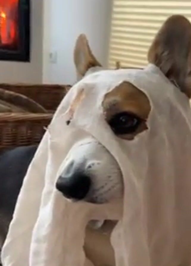 A close-up video shows a corgi dog wearing a makeshift ghost costume consisting of a white cloth with eye holes