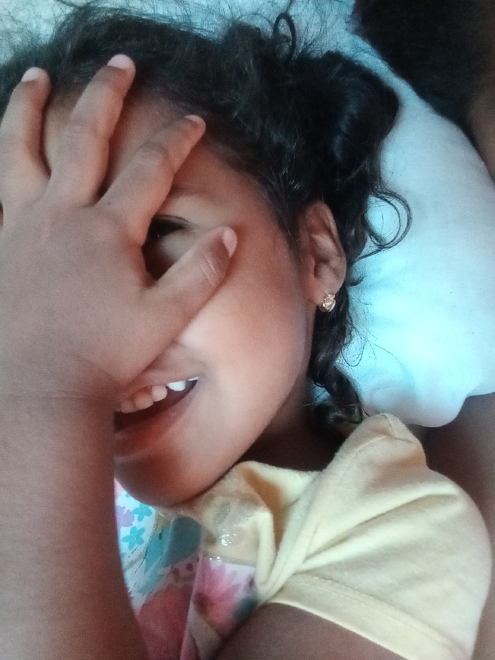 A young child with medium-dark skin and dark, curly hair is depicted in a close-up, angled shot. The child's right hand (viewer's left) covers the upper left side of their face, partially obscuring the left eye and forehead. The child is smiling broadly, revealing upper and lower white teeth. A small, light-colored earring is visible in the child's right earlobe. A yellow garment is present on the child's right arm and shoulder, with a floral-patterned fabric (pink and blue) visible beneath it. The child's head rests against a light blue or white soft surface, consistent with a pillow or bedding in an indoor environment in Las Tejerías, Venezuela.