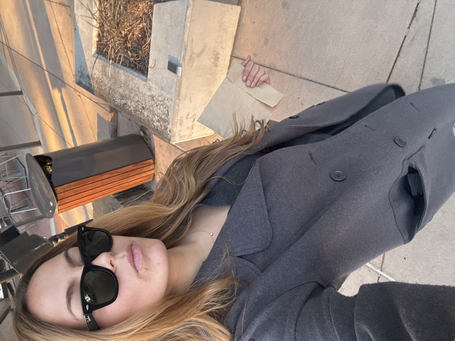 A woman takes a selfie outdoors on a sidewalk. She wears sunglasses and a gray overcoat. Her hair is long and blonde. She holds a brown paper bag in one hand. A planter box and a trash receptacle are visible in the background, along with pavement and building shadows. The photo has a slightly tilted perspective.