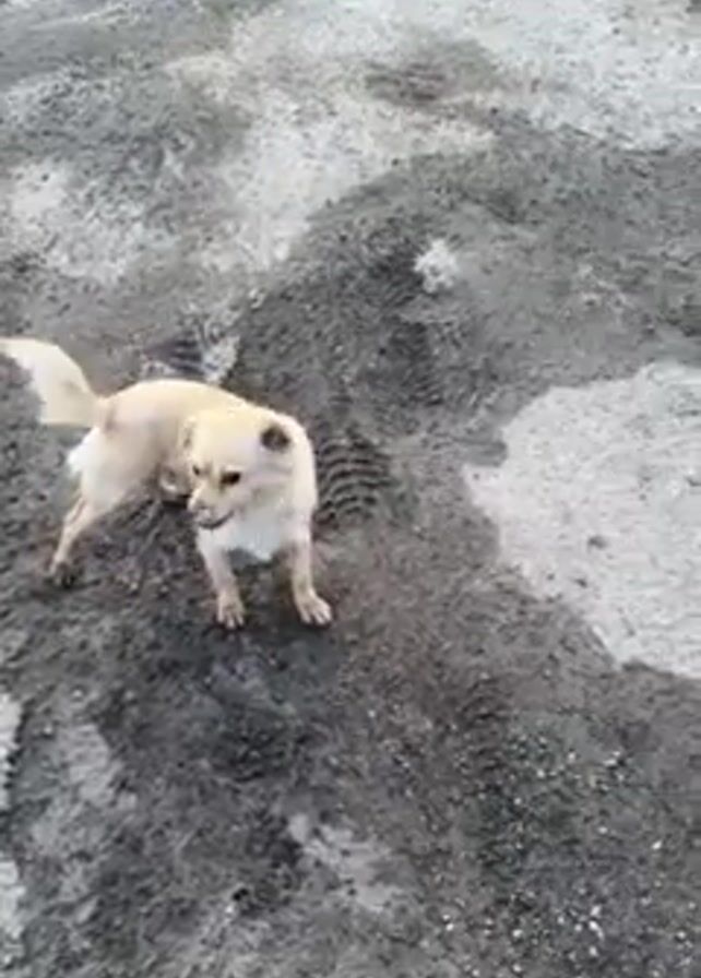 The scene shows two dogs on a muddy ground. The first dog, a small, light-brown dog, turns its head, looks at the camera, then back away. A second dog, larger and with black, brown, and white fur, appears and stands still. Both dogs run around the muddy area. Tire tracks can be seen on the ground. The background noise sounds like car.