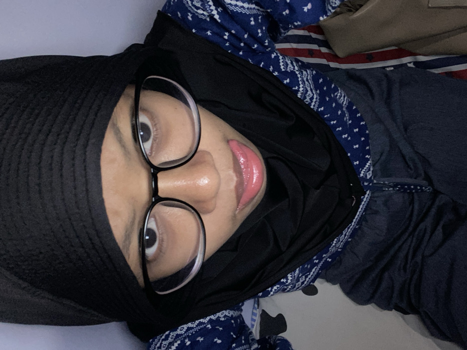 A single individual is depicted in a high-angle, close-up photograph taken indoors in Kebonsari, Indonesia. The person wears a black hijab, black-framed glasses, a blue long-sleeved shirt with a white patterned design, and dark blue or grey trousers with a visible drawstring. The individual's eyes are open and directed towards the camera, while their mouth is slightly open, exhibiting a visible tongue extended outwards. Lips appear glossy. The background consists of a light purple/grey wall on the upper left, transitioning to a vertical red, white, and blue striped pattern on the right, adjacent to a beige object, possibly a bag.