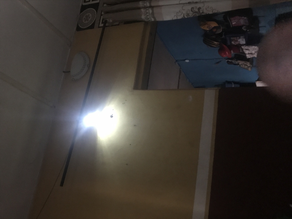 The image displays an interior room located in Oba-Ile, Nigeria. The visible wall is painted in two horizontal sections: an upper pale yellow and a lower dark brown, separated by a thin white stripe. A single, intensely bright, unshielded light source is affixed to the upper left portion of the pale yellow wall, generating significant glare. A dark, thin horizontal bar is mounted across the upper wall section. Near the ceiling on the right, a circular, flush-mounted light fixture is present. An open doorway to the right leads into an adjacent room, revealing a distinct blue wall adorned with multiple hanging objects, including hats, bags, and framed items. A patterned curtain with a dark border partially obscures the view into this adjacent room. The ceiling is light-colored with visible structural beams. The immediate foreground is blurred and dark, without discernible features. No individuals or specific actions are identifiable within the scene.