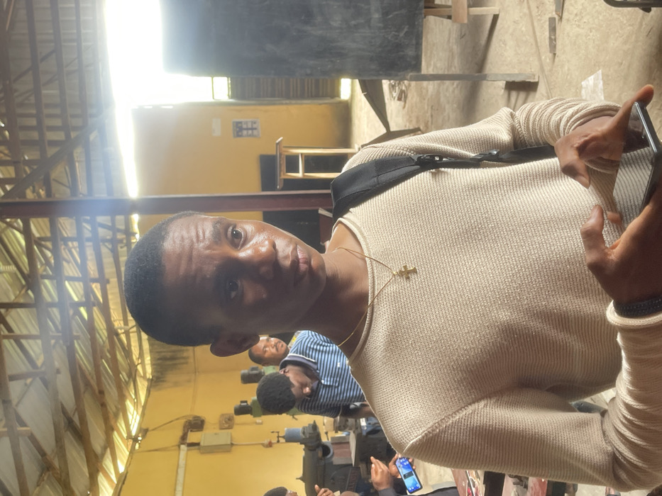 The image depicts an indoor scene in Uturu, Nigeria, likely a workshop or vocational classroom