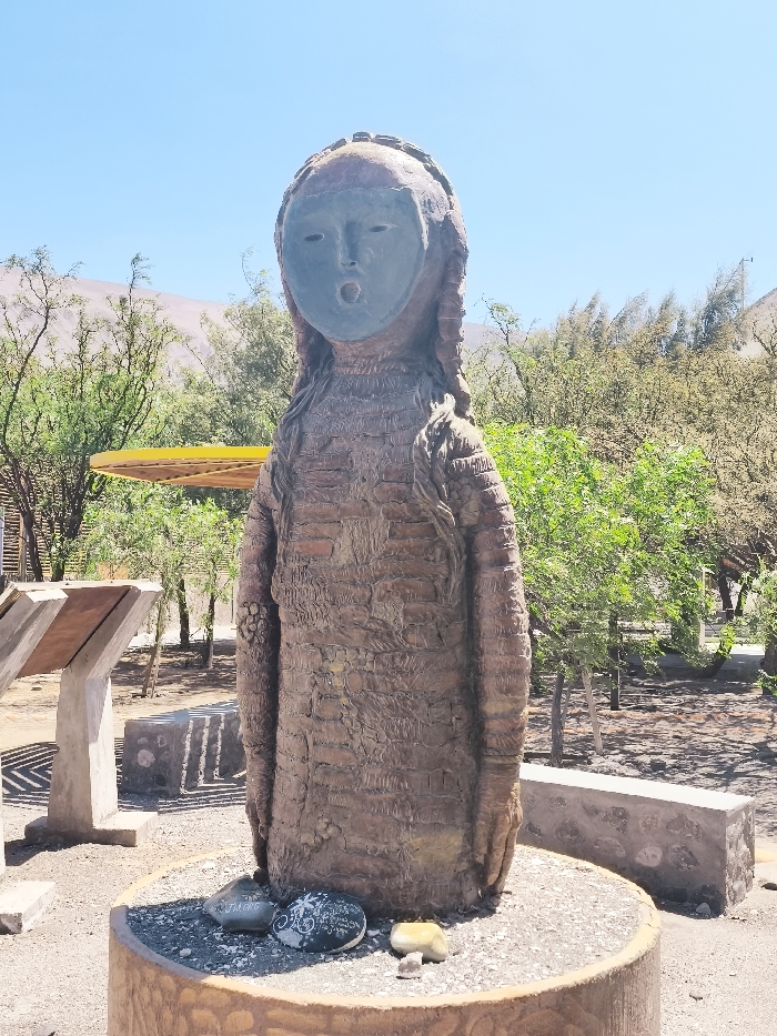 The image displays a weathered anthropomorphic statue centrally positioned in an outdoor setting in Camarones, Chile