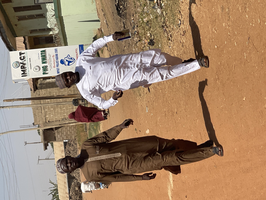 Two adult males walk towards the viewer on a reddish-brown dirt road in Muchiya LGA, Kaduna State, Nigeria