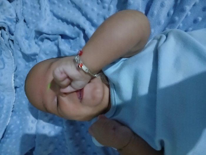 An infant is depicted lying supine on a light blue, textured blanket featuring raised dimples. The infant has a light to medium skin tone and is clothed in a plain, light blue, short-sleeved garment. The left arm is bent, with the left fist positioned adjacent to the face, partially obscuring the nose and mouth. A silver-colored bracelet adorned with red and clear beads is present on the infant's left wrist. A subtle green mark is observed on the infant's forehead. The infant's eyes are closed or partially closed, and the mouth is slightly agape. The visual information within the image does not allow for verification of the location as Juan Griego, Venezuela.