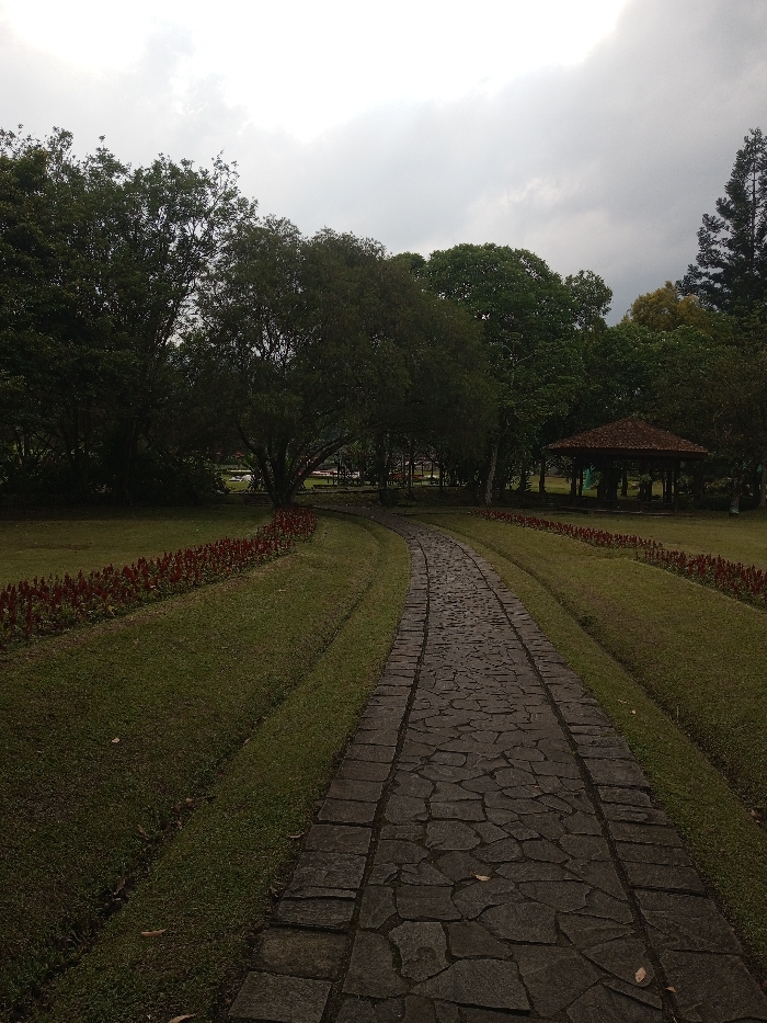 A stone pathway curves through a verdant park landscape beneath an overcast sky