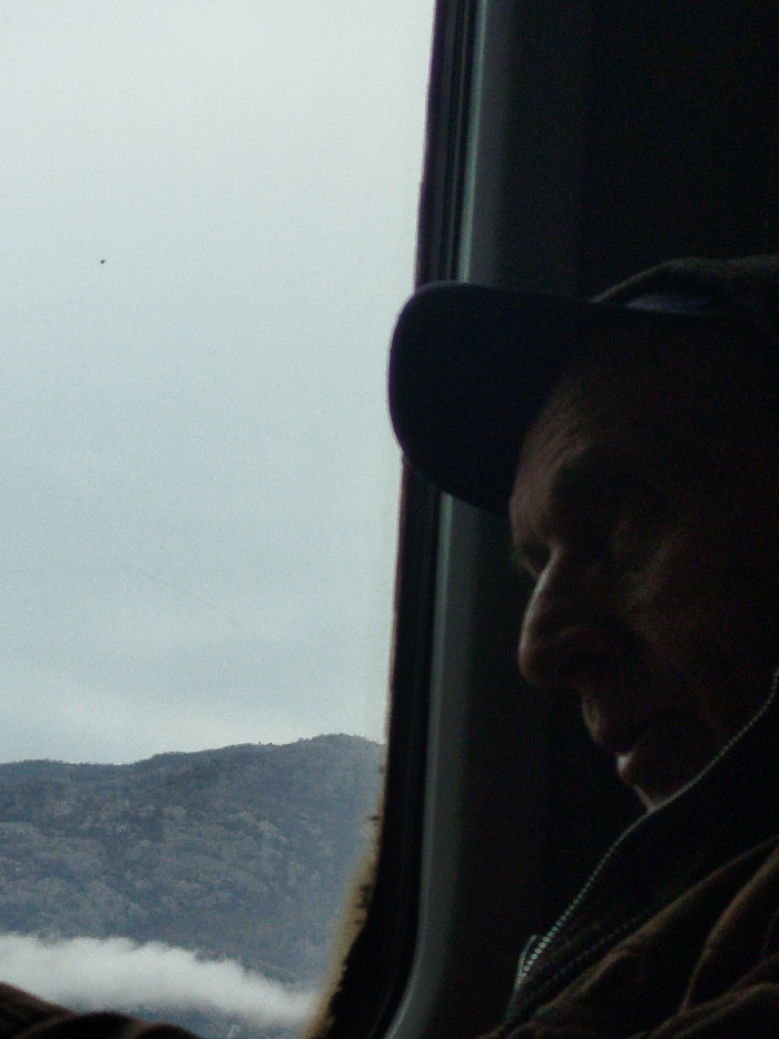 The image captures a view from an interior, likely a vehicle, looking outwards through a window. On the right, a male individual is partially visible in silhouette, wearing a dark cap and a dark zippered jacket. His head is tilted downwards, and his face, seen in profile, is largely obscured by shadow. A dark vertical window frame separates him from the exterior scene. The exterior, on the left, features an overcast, light grey sky. A small dark speck is visible in the upper left of the sky. Below the sky, a range of mountains, sparsely forested or bare, stretches across the mid-ground. A layer of white clouds or fog lies at the base of the mountains, indicating an elevated perspective. The specific location within the city of Unknown, Unknown is not discernible from the visual evidence.